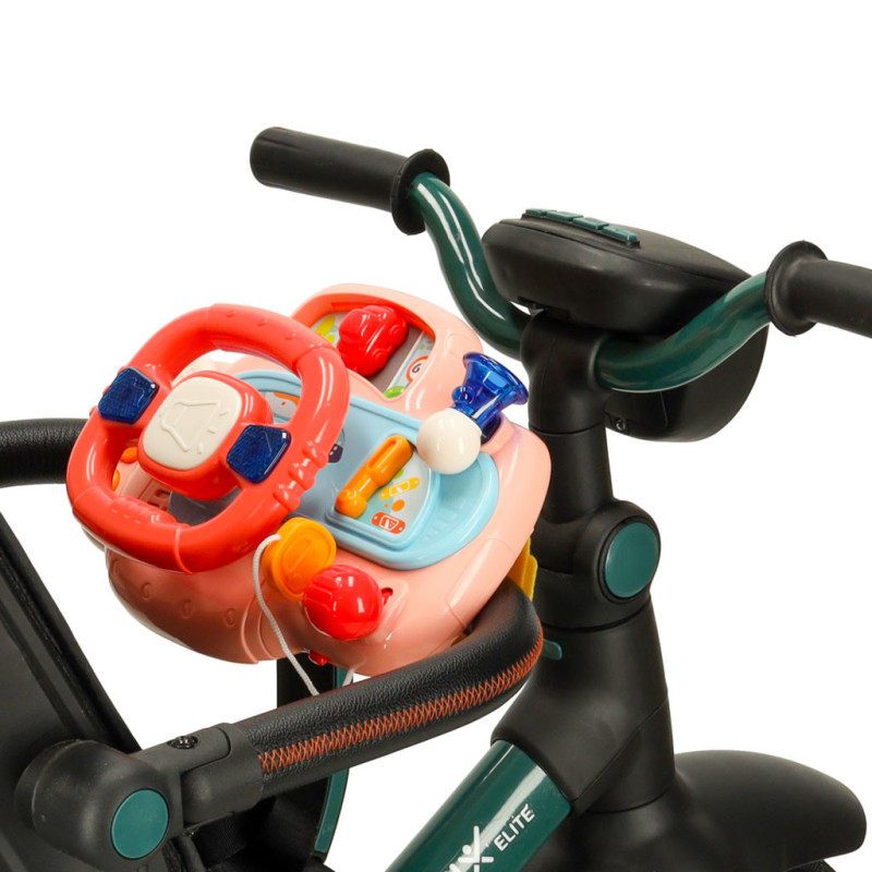 Praktický popruh umožňuje volant pripevniť na kočík, čím sa hra stáva možná aj počas prechádzok. Volant zároveň rozvíja jemnú motoriku a stimuluje zmysly – sluch i zrak.