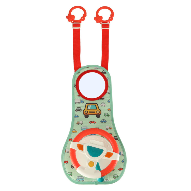 Hračku pripevníte k opierkam hlavy predného sedadla pomocou plastových koliesok na nastaviteľných popruhoch.