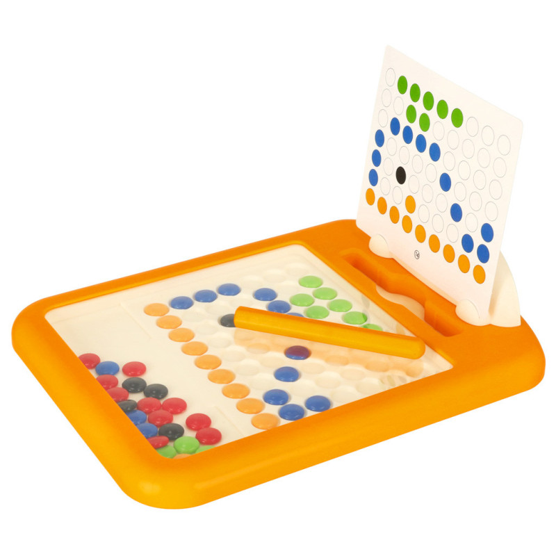 Magnetická tabuľa má farebné gombíky, ktoré možno premiestňovať pomocou magnetického pera a vytvárať tak rôzne mozaiky, vzory a obrázky. Deti môžu nasledovať dostupné príklady alebo vymýšľať nové vlastné výtvory. Na tabuli sa nachádza zajačik, ktorý batoľa sprevádza počas hry.
