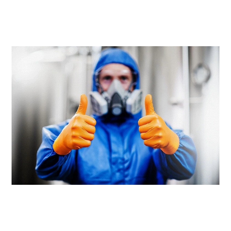 Nitrilové rukavice GoGrip oranžové veľkosti XL, 50 ks sú špičkové jednorazové rukavice vyrobené z odolného nitrilu, ideálne pre náročné pracovné podmienky. Vyznačujú sa trojnásobnou hrúbkou oproti štandardným rukaviciam, 3D diamantovou textúrou pre vynikajúci úchop, a sú vhodné pre prácu v mastnom a vlhkom prostredí. Tieto rukavice neobsahujú latex, sú bez púdru a spĺňajú normy EN ISO 374-1, EN ISO 374-2, EN ISO 374-4, EN ISO 374-5, EN ISO 16523-1 a EN ISO 21420, čo zaručuje vysokú ochranu proti chemikáliám a mikroorganizmom.