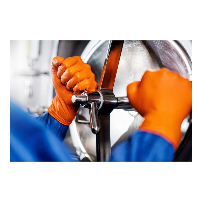 MERCATOR® gogrip nitrilové rukavice XL – 50 ks, oranžové predstavujú vysokokvalitnú ochranu pre prácu v náročných podmienkach. Vďaka 3x hrubšiemu nitrilu a 3D diamantovej textúre zaisťujú bezpečný úchop, komfort a ochranu aj v mastnom či vlhkom prostredí.