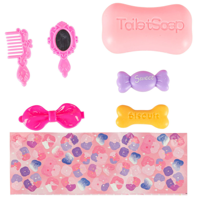 - Príslušenstvo: mydielko, hrebeň, zrkadlo, sponka do vlasov, cukríky, torta