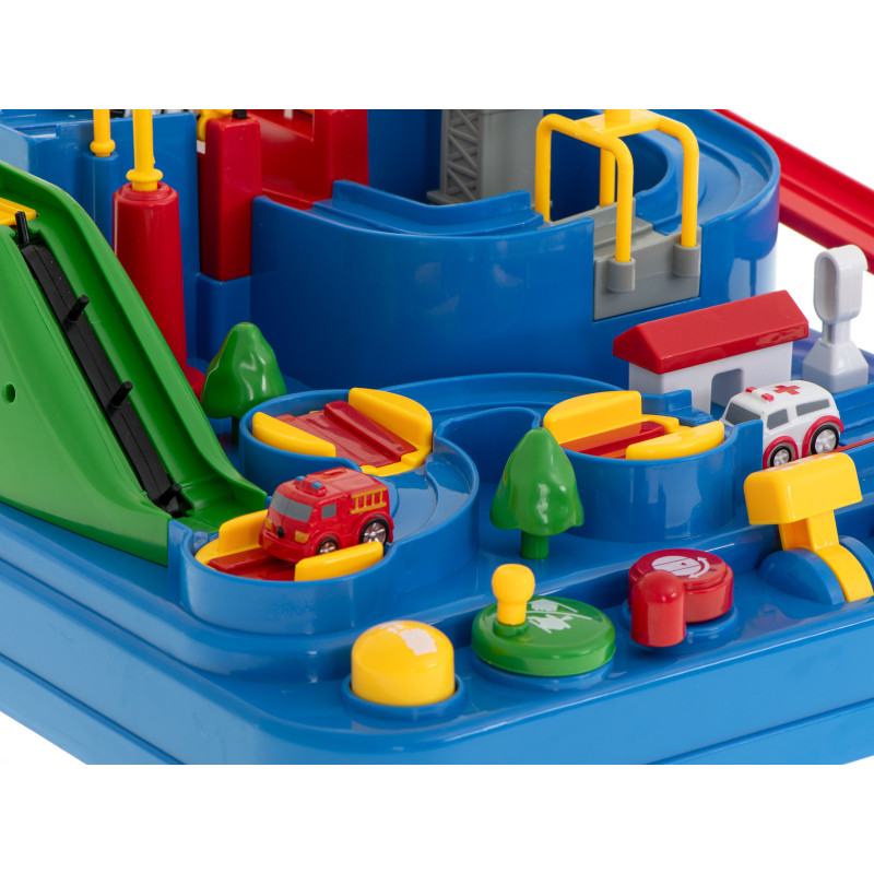 Multifunkčná autodráha je ako stvorená pre malých dobrodruhov. Ovládaj tlačidlá a otočné prvky, aby si previedol vozidlá cez ozubené kolieska, výsuvné mosty a ďalšie nástrahy. Vyzerá to jednoducho? Presvedč sa sám!