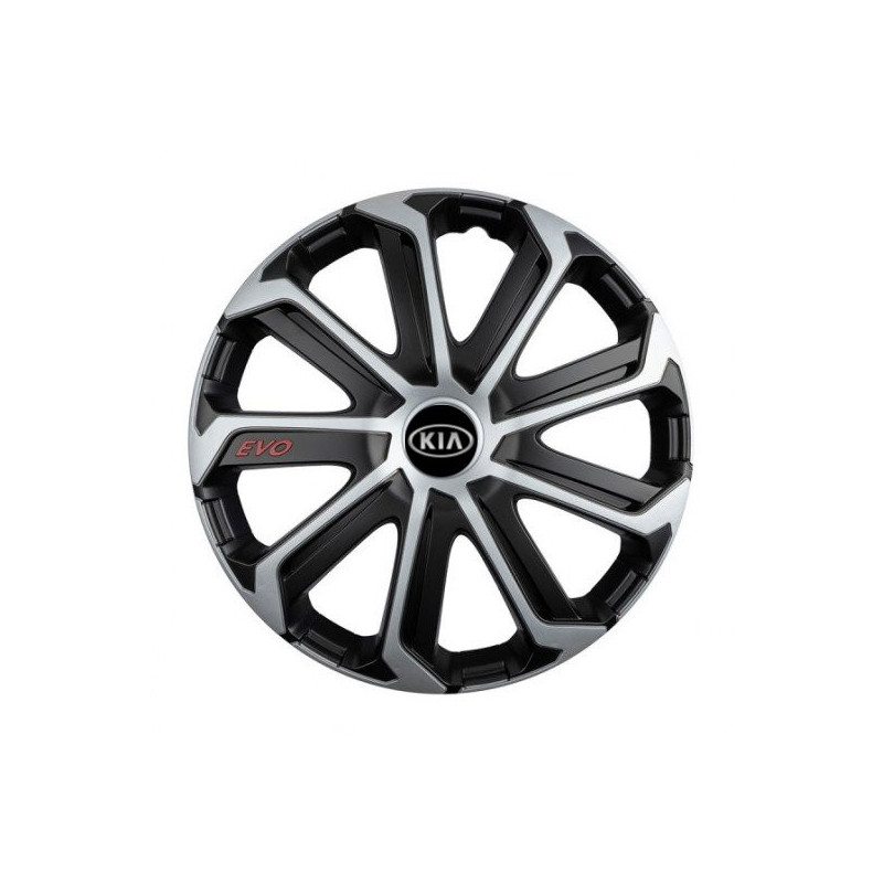 Puklice 14 Evo black&silver pre Kia (staršie logo) na ocelové disky. Pre kolesá o veľkosti R14 so živicovými samolepkami Kia (staršie logo).Príjemca :