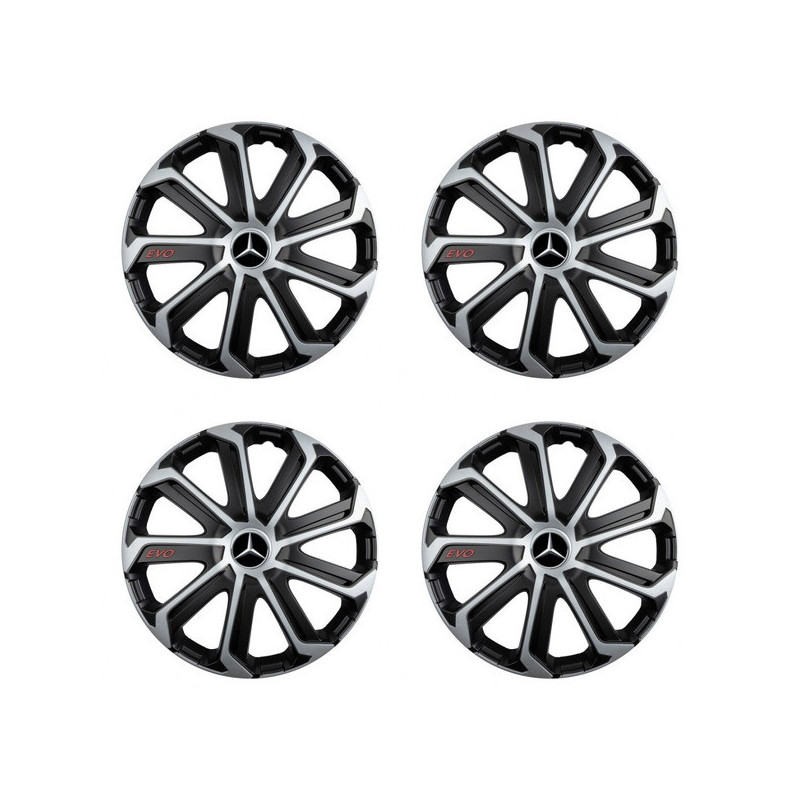 Puklice 15 Evo black&silver pre Mercedes na ocelové disky. Pre kolesá o veľkosti R15 so živicovými samolepkami Mercedes.Príjemca :