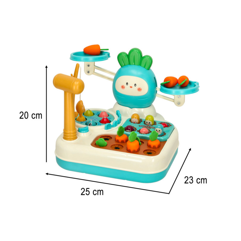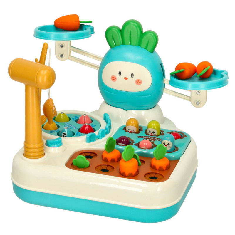 Farebné komponenty, ako sú rybky, mrkvy a krtkovia, robia hru atraktívnou a podnecujú zvedavosť dieťaťa. Vďaka priloženej udici, kladivku a váhe bude každá hra iná a zábavná.