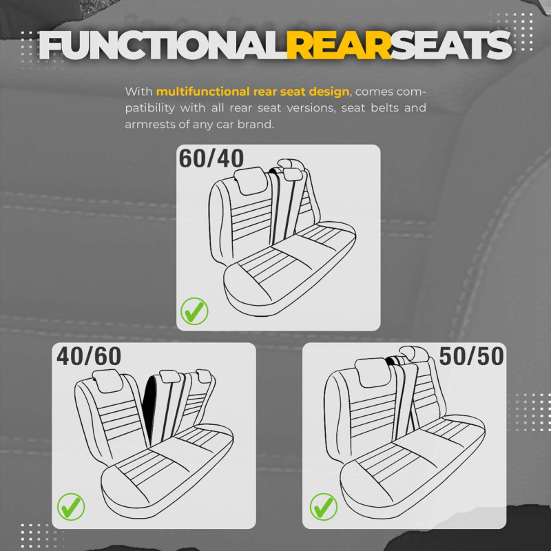 Univerzálne použitie: Poťahy majú zapínanie na zadnom sedadle, vďaka čomu pasujú na väčšinu sedadiel dostupných na trhu (nedelené pohovky). Poťahy nemajú výrezy pre pásy a zadné opierky hlavy z dôvodu ich použitia pre rôzne modely áut. Potrebné otvory si musíte urobiť sami po precíznom osadení a montáži.