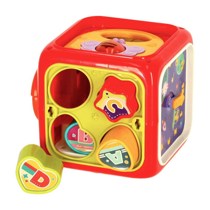 Súprava obsahuje aj štyri kocky rôznych tvarov, ktoré bude musieť batoľa priradiť k sebe v triedičke.