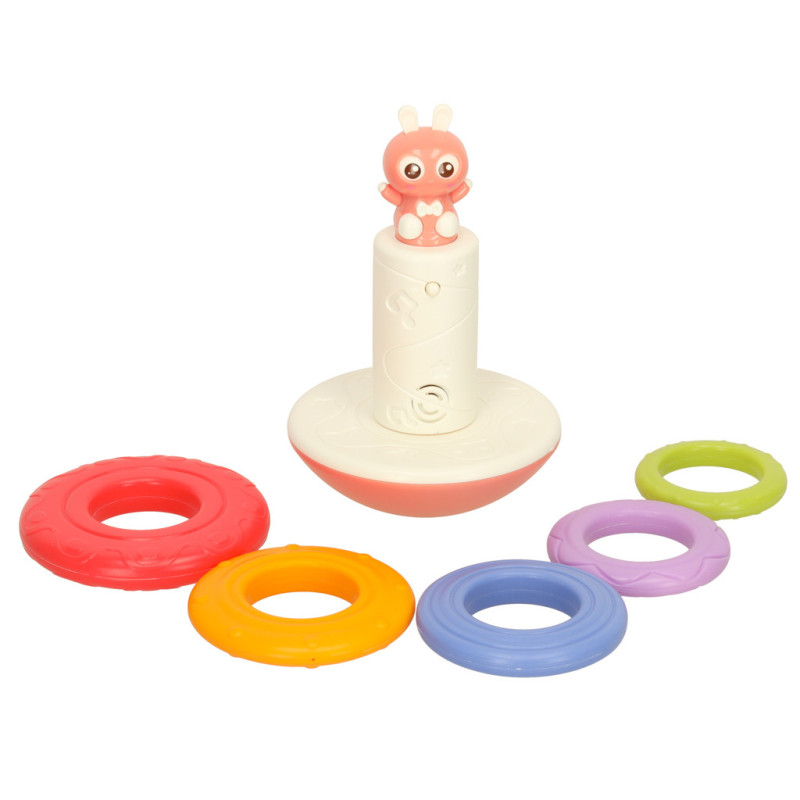 Hračka sa skladá z hojdacieho podstavca s malým kamarátom zajačikom apiatich diskov rôznych veľkostí. Úlohou dieťaťa je vrstviť disky jeden po druhom a postaviť dúhovú vežu. Pri každom umiestnení diskov sa z hračky ozve veselá melódia, ktorá batoľa povzbudí k ďalšej hre.