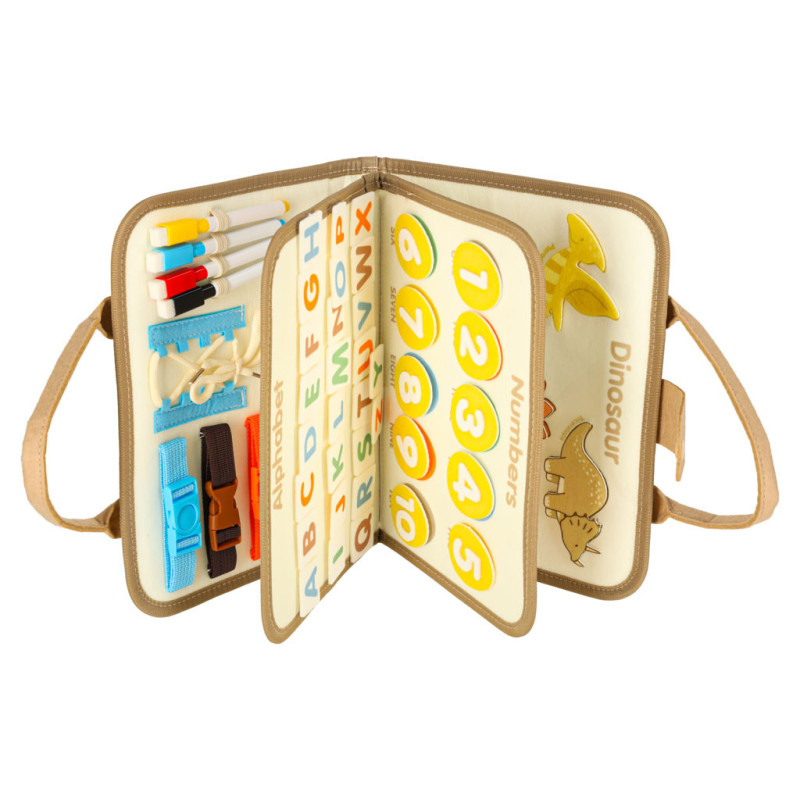 Senzorická aktovka Dino je výnimočná edukačná hračka, ktorá spája zábavu, učenie a podporu samostatnosti. Navrhnutá v duchu Montessori, rozvíja jemnú motoriku, logické myslenie a praktické zručnosti detí už od 3 rokov. Vďaka kompaktnému formátu aktovky je ideálna na doma, do škôlky aj na cesty.