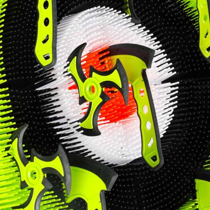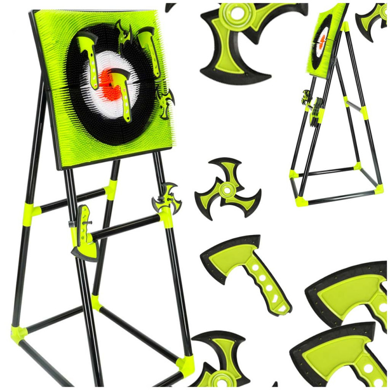 V sade sa nachádza 5 plastových sekier a 5 shurikenov, ktoré majú zakončenie zo silikónu a nemajú ostré hrany. Vďaka tomu sú vhodné aj pre mladších hráčov. Silikónový terč umožňuje dobré uchytenie vrhaných predmetov a podporuje hru na presnosť. Deti môžu hádzať z blízka alebo si postupne zvyšovať úroveň obtiažnosti hádzaním z väčšej vzdialenosti.